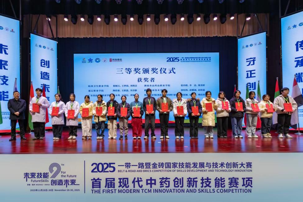 近日,2025一带一路暨金砖国家技能发展与技术创新大赛“现代中药创新技能赛项”在亳州职业技术学院圆满落幕。我院指导教师李雪倩、牛学义、2024级中药班徐钰炜、赵雅涵、赵依蕊三位同学组成的参赛团队,历经初赛选拔与现场决赛的双重竞技考验,在全国90余支精英队伍的激烈比拼中脱颖而出,凭借扎实的专业功底和出色的实操能力,荣获大赛三等奖(铜奖)。