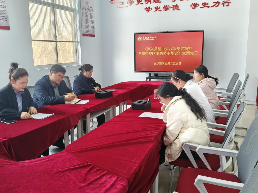 为持续加强作风建设,严明纪律规矩,医学院学生第二党支部召开主题党日活动,专题学习贯彻中央八项规定精神,聚焦严禁违规吃喝问题,深化纪律警示教育。