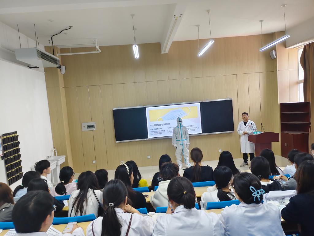 本次培训系统介绍了传染性疾病的基本概念、分类以及我国在预防与治疗方面的政策措施和最新进展。并对春季常见传染性疾病、高校内易发的传染性疾病的发病机制、传播途径以及预防治疗手段进行了重点讲解。结合案例强调了提高个人防护意识和公共卫生干预的重要性,现场开展了手消毒法、口罩佩戴、医用丁腈手套穿戴及防护服穿脱的实操练习。